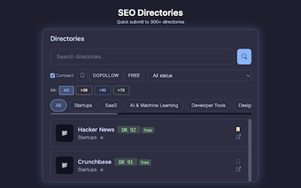 SEO 디렉토리는 선별된 SEO 디렉토리 제출을 통해 링크 구축 프로세스를 단순화하도록 설계된 Chrome 확장 프로그램입니다. 이 무료 도구는 품질 디렉토리의 정기적으로 업데이트된 목록을 제공하여 사용자가 제출을 효율적으로 추적하고, 사이트를 북마크하고, 브라우저 사이드바에서 바로 백링크 전략을 관리할 수 있도록 합니다. 카테고리 및 도메인 권한에 따른 스마트 필터링과 같은 기능을 통해 사용자는 자신의 필요에 가장 적합한 디렉토리를 쉽게 찾고 정리할 수 있습니다.